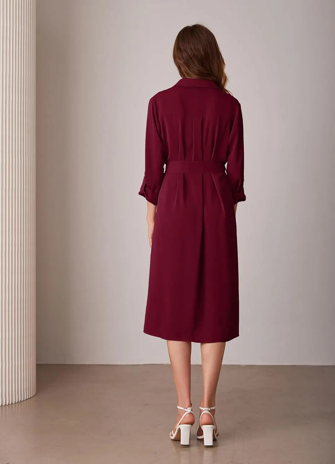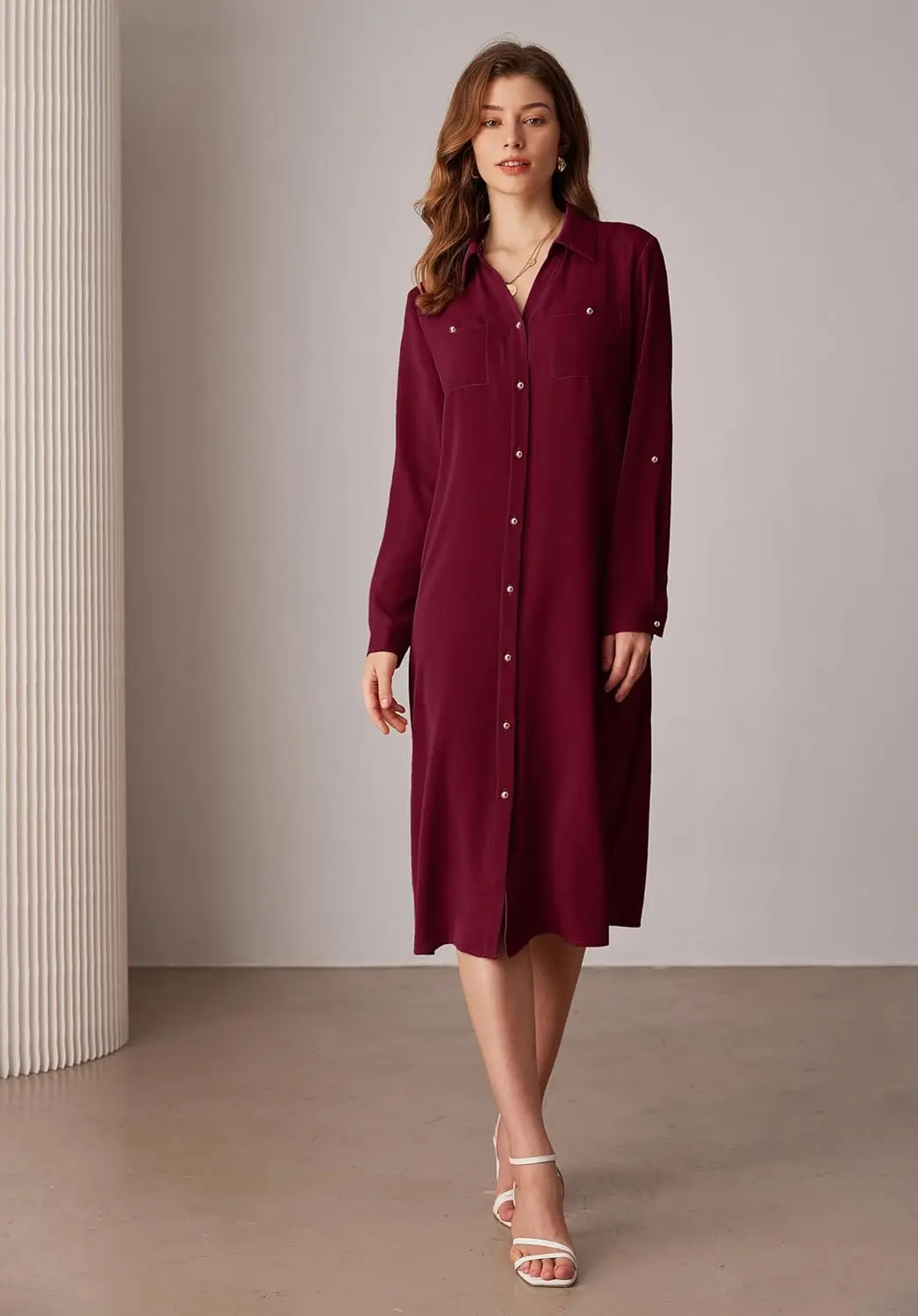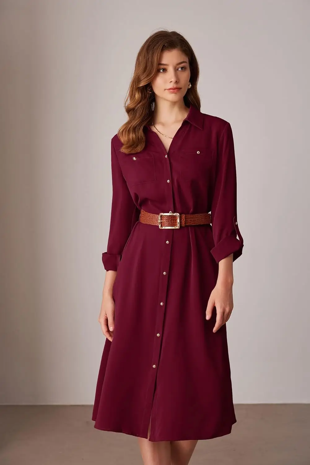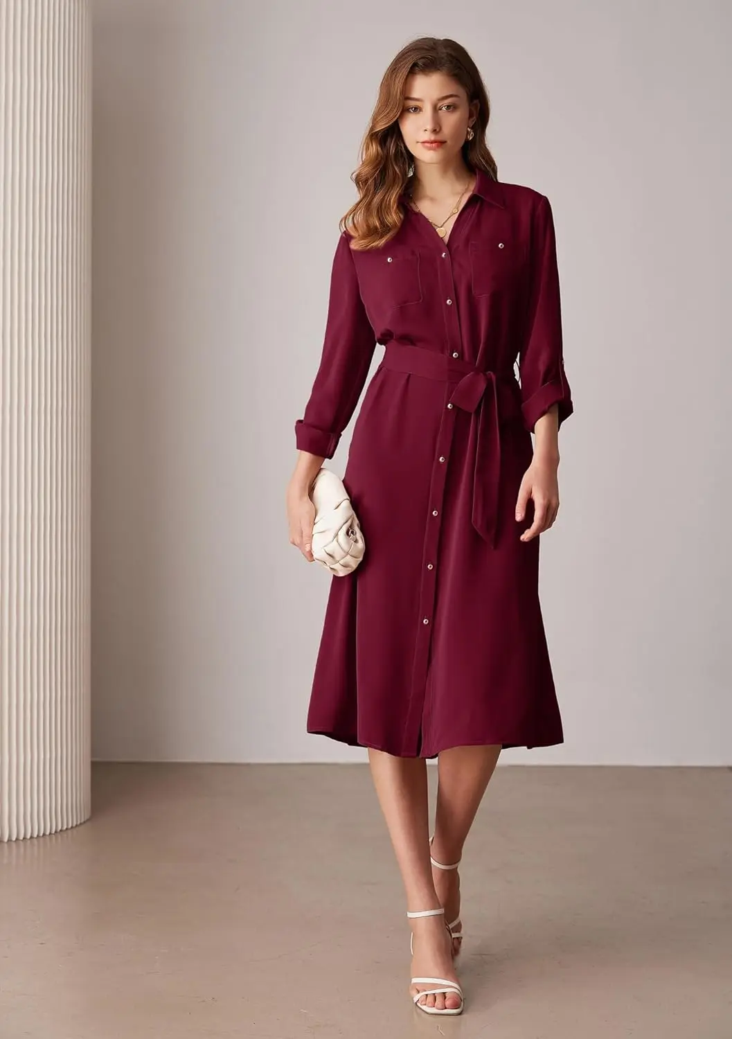 Women's Casual Summer Midi Dress Long Sleeve Button Shirt Adjustable Tie Waist Solid Pattern Front Logo Natural Waistline Woven